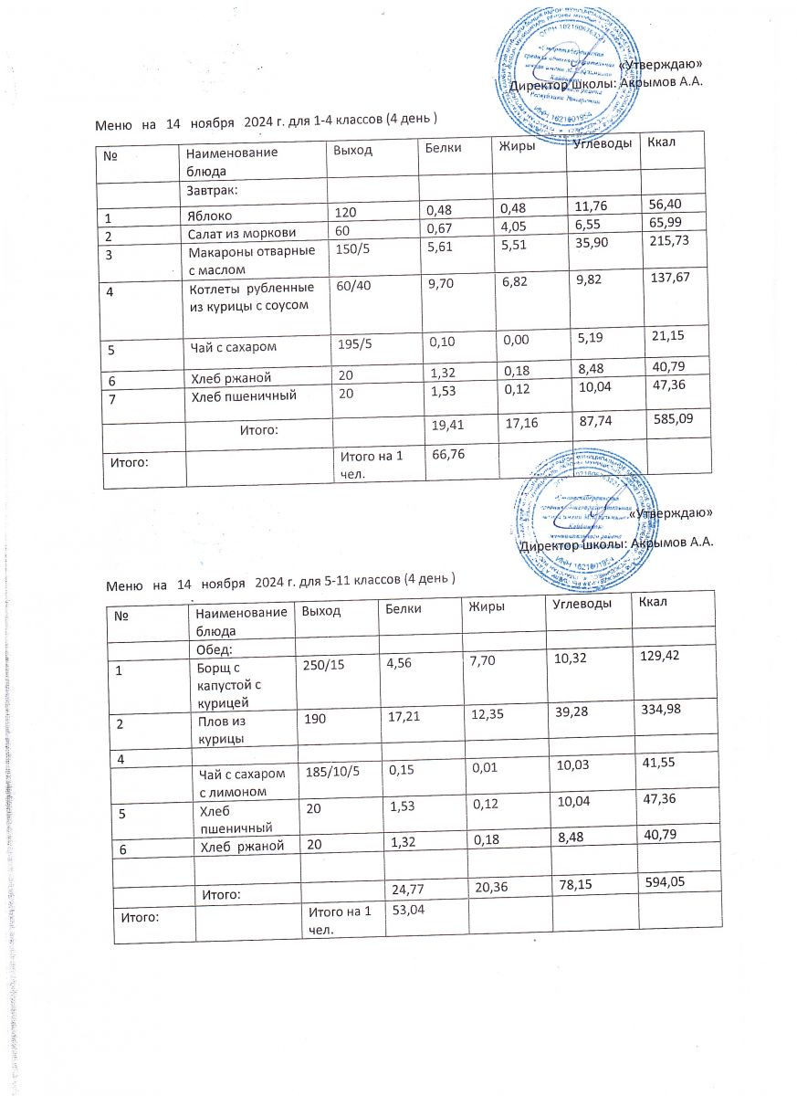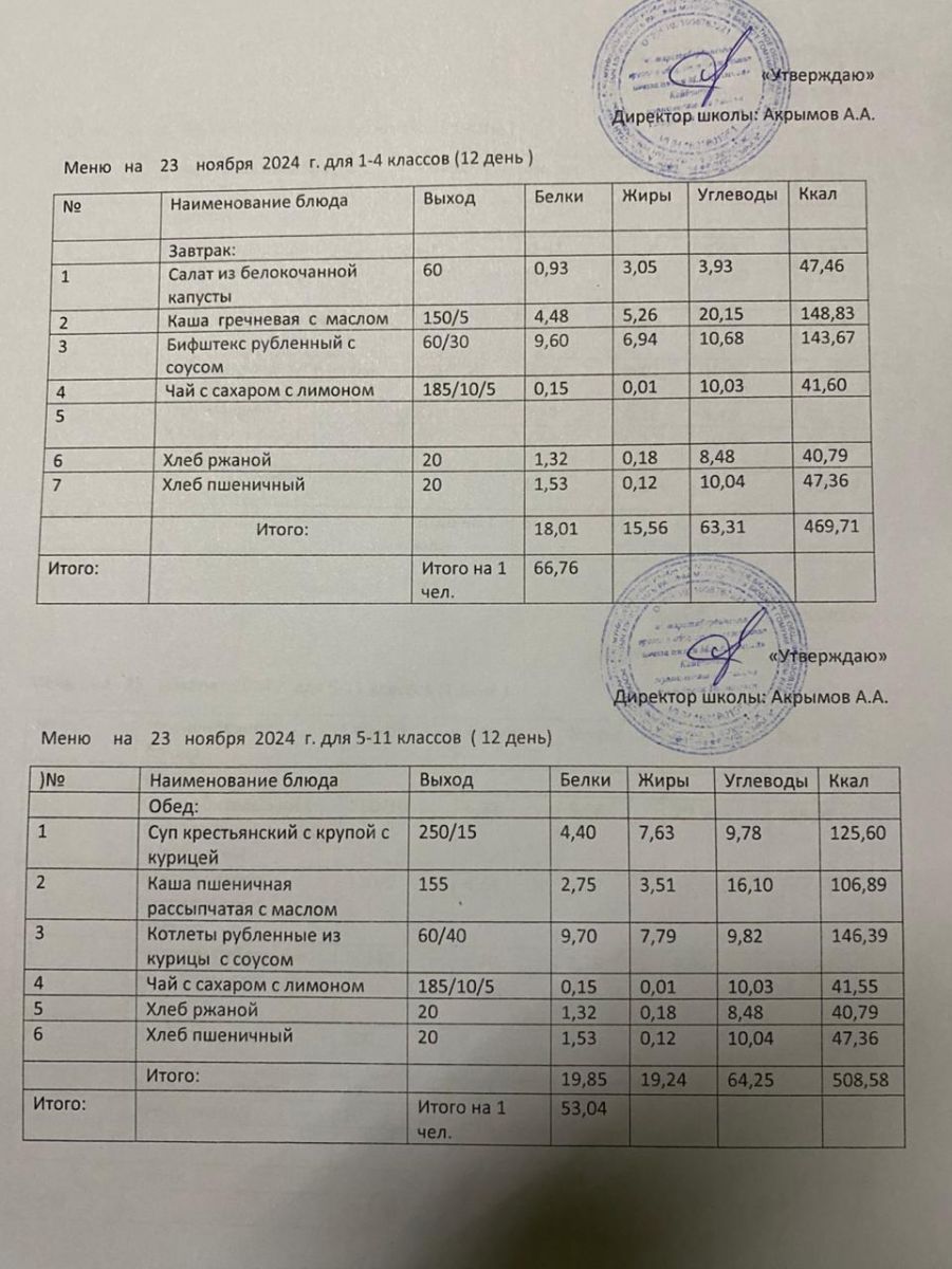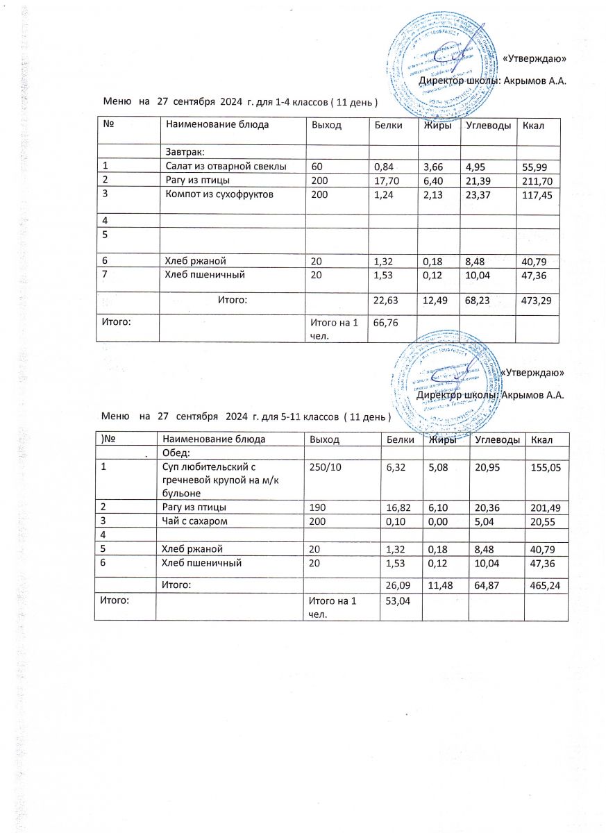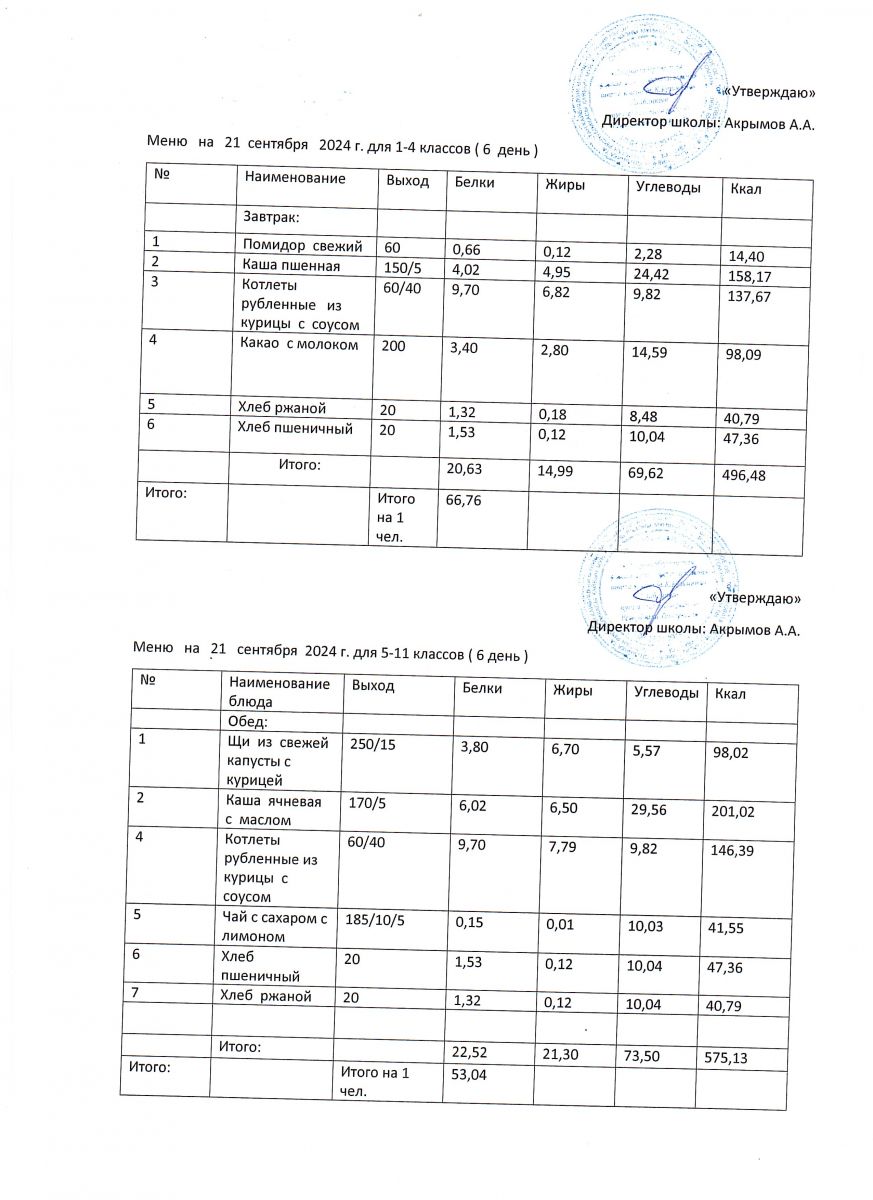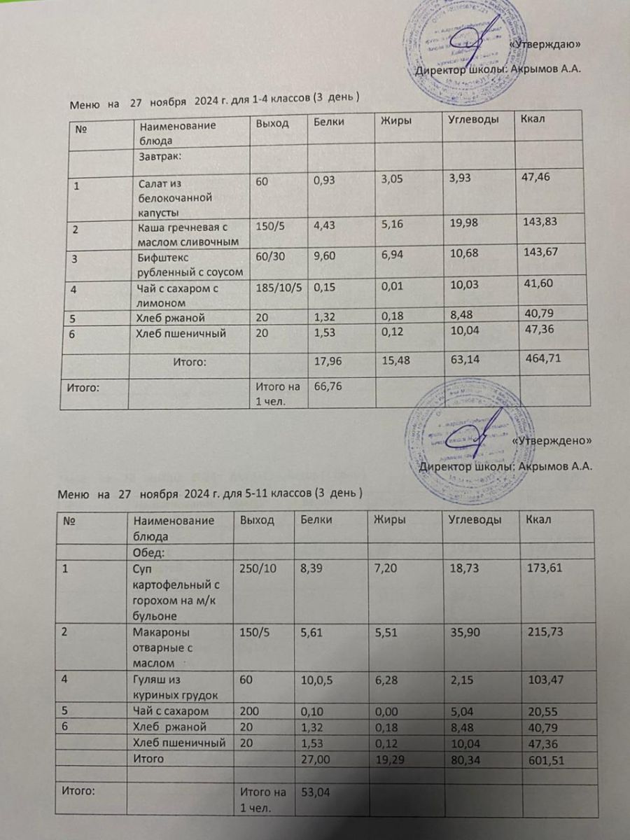 Ежедневное меню учащихся 1-4, 5-11 классов на 2024-2025 уч.год