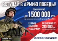 Вступай в Армию Победы! Только до 31 июля 2024 года подпиши контракт на военную службу и получи единовременную выплату до 1 500 000 рублей. Контактный тел: 8(999)1624921
