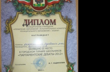 Поздравляем команду учащихся гимназии и их руководителя Архипову О.А. - учителя истории с 3 местом в городском турнире школьников "Парламентские дебаты-2012"!