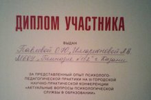 Педагог - психолог гимназии Павлова О.Ю. награждена дипломом участника за на предоставленный опыт психолого-педагогической практики III Городской научно-практической конференции "Актуальные вопросы психологической службы в образовании"