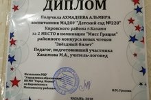 Поздравляем Ахмадееву Альмиру, занявшую 2 место в номинации "Мисс Грация" районного конкурса юных чтецов "Звездный билет". Педагог, подготовивший участника - учитель-логопед Хакимова М.А.