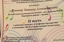 Поздравляем музыкального руководителя Якимову Т.А, занявшую 2 место в районном конкурсе "Симфония мастерства" в номинации "Вклад в нравственное воспитание дошкольников".