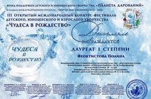 Поздравляем Лауреата III открытого международного конкурса-фестиваля детского, юношеского взрослого творчества "Чудеса в Рождество" 25.01.2023