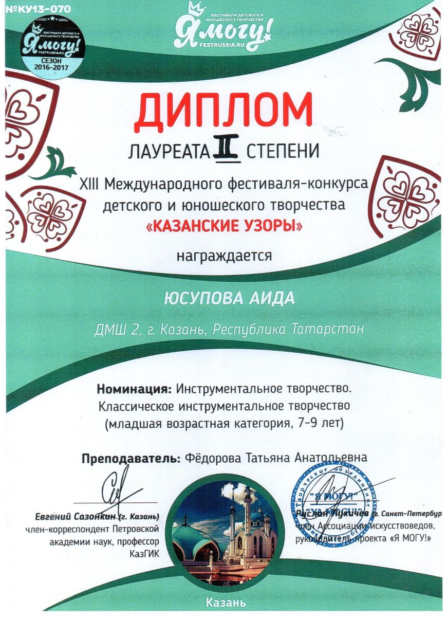 Юсупову Аиду, с присвоением звания ЛАУРЕАТ II СТЕПЕНИ, класс преподавателя Т.А.Федоровой