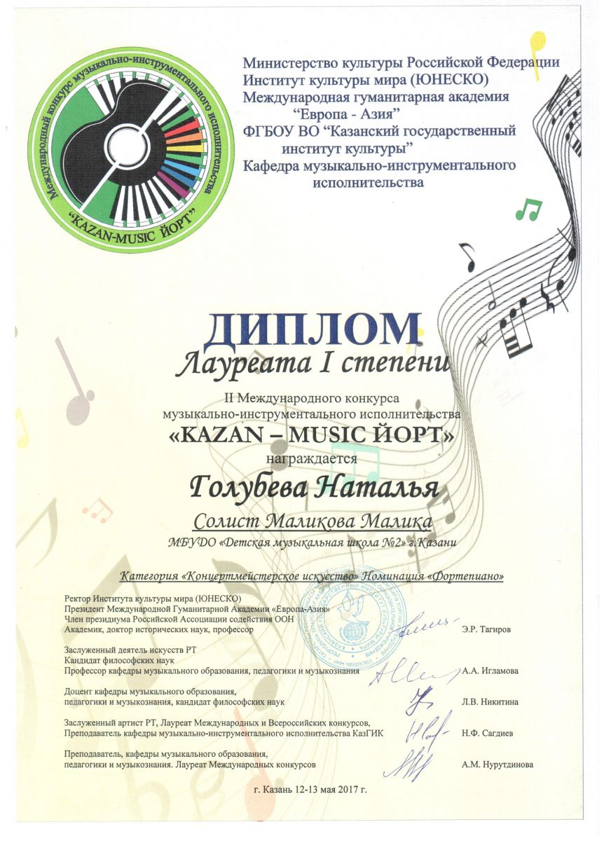 Маликову Малику, с присвоением звания ЛАУРЕАТ III СТЕПЕНИ, класс преподавателя С.В.Муллануровой, концертмейстер Н.В.Голубева