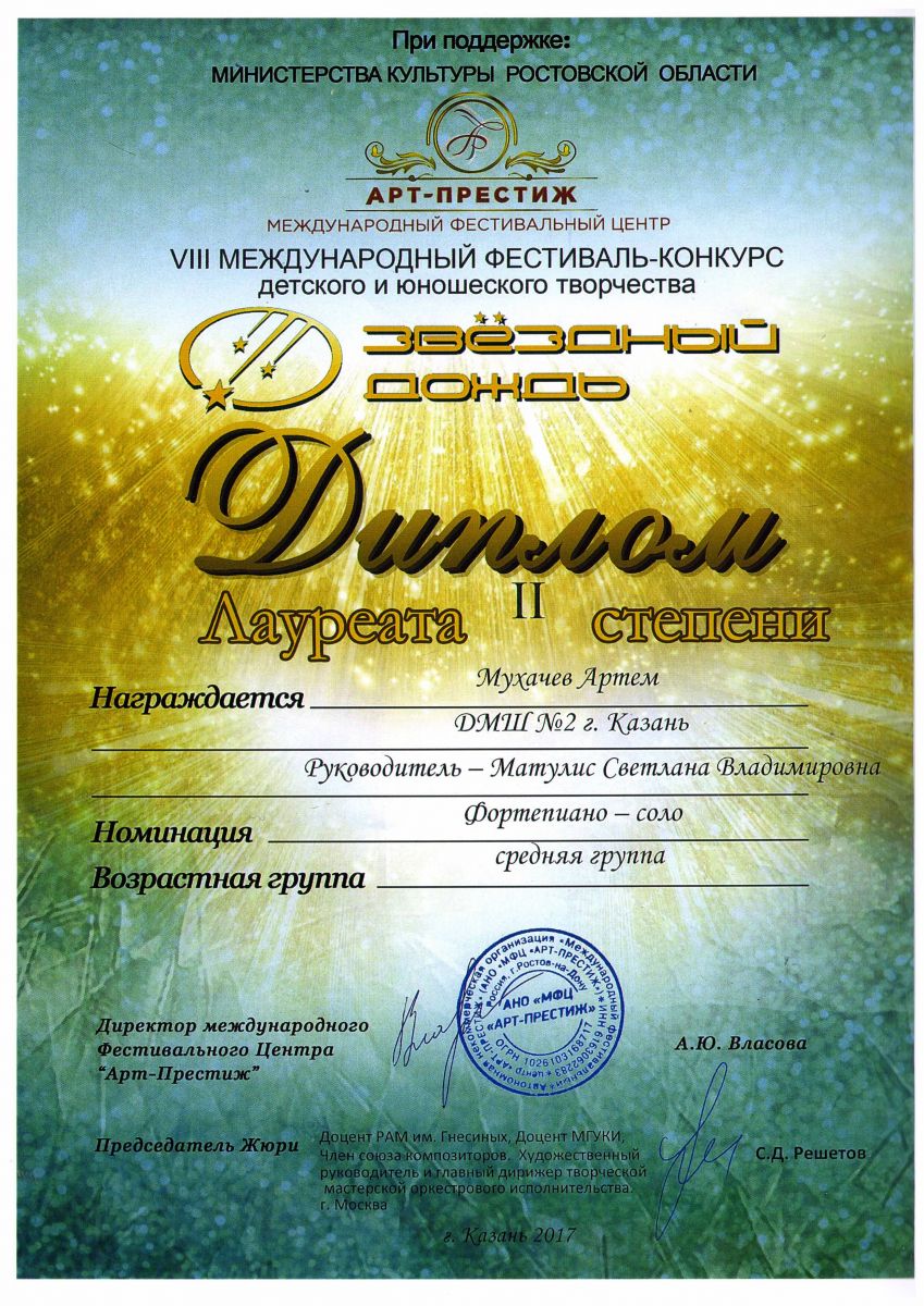 Мухачева Артема, с присвоением звания ЛАУРЕАТ II СТЕПЕНИ Класс преподавателя С.В.Матулис