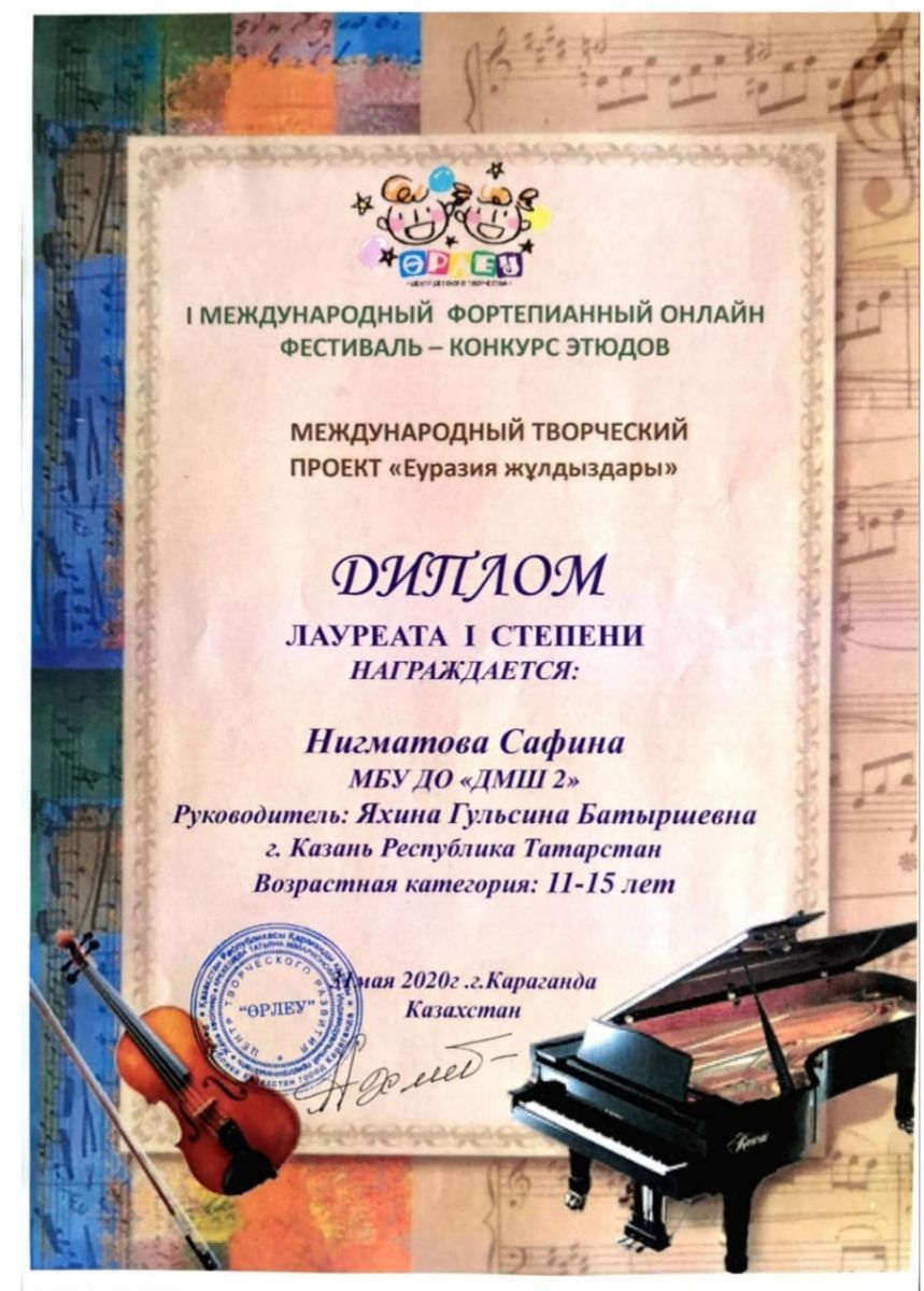 Нигматову Сафину (фортепиано) с присвоением звания ЛАУРЕАТ I СТЕПЕНИ