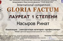 Сегодня своим успехом нас радует педагог Насыров Ринат Рашитович. Он стал Лауреатом I степени Международного конкурса "GLORIA FACTUM" в категории «Профессионал». Организатором мероприятия выступило Международное Общественное Движение «ГРАНИ КУЛЬТУРЫ».