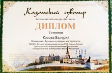 4 декабря состоялся Всероссийский конкурс "Казанский сувенир". Для наших детей-духовиков сложный конкурс, т. к. в номинации духовых и ударных инструментов участвовала много ССМШ. Несмотря на это, Косова Валерия (преподаватель И. Г. Ферапонтова) получила диплом 1 степени. Так держать!
