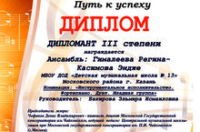 Поздравляем Гималееву Регину и Касимову Эндже с III местом в Международном конкурсе "Путь к успеху", руководитель Бакирова Э.И.А также ансамбль кураистов "Чишмэ", занявших III место в этом же конкурсе, руководители: Мухутдиновы Наиля Равилевна и Ренат Сабирович. Поздравляем и желаем дальнейших творческих побед!