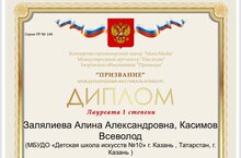 В г.Казань проходил Международный конкурс детско-юношеского творчества "Палитра талантов", в котором приняли участие учащиеся народного отделения МБУДО "Детская школа искусств №10" г.Казани (класс преподавателя Залялиевой Алины Александровны). Дуэт в составе преподавателя Залялиевой А.А. и Касимова Всеволода удостоился диплома лауреата I степени. Касимов Всеволод стал лауреатом II степени, ансамбль гитаристов лауреатами I степени, ансамбль домристов победителями I степени. Поздравляем ребят и преподавателя Залялиеву Алину Александровну с успехами в конкурсе и желаем дальнейших творческих побед. Администрация школы выражает благодарность преподавателю Залялиевой А.А. за подготовку учащихся к конкурсу.
