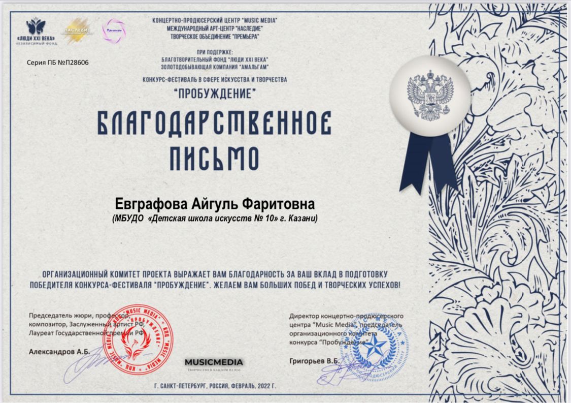 В феврале 2022 года в г.Санкт-Петербург проходил Международный фестиваль-конкурс "Призвание". На конкурсе МБУДО "Детская школа искусств №10" г.Казани с успехом представили учащиеся народного отделения (класс преподавателя Залялиевой А.А., концертмейстер Фахрутдинова М.С.). По итогам конкурса Касимов Всеволод и дуэт Залилиевой А.А. и Касимова Всеволода стали лауреатами 1 степени, ансамбли гитаристов и домристов - лауреатами 2 степени. Поздравляем учащихся и преподавателей с успехами на конкурсе и желаем продолжать покорять новые вершины мастерства. Администрация школы выражает благодарность преподавателям Залялиевой Алине Александровне и Фахрутдиновой Малике Саидакрамовне за подготовку учащихся к конкурсу.