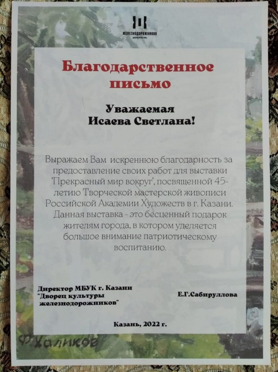 24 марта в МБУК г.Казани "Дворец культуры железнодорожников" проходила выставка работ под названием "Прекрасный мир вокруг", посвященная 45 летию Творческой мастерской живописи Российской Академии Художеств в г.Казани. На выставке свою работу "Солнечное детство" (портрет бабушки и дедушки, х/м, 120*140, 2008 год), представила преподаватель МБУДО "Детская школа искусств №10" г.Казани Валеева Светлана Викторовна. Поздравляем Светлану Викторовну с участием в выставке, которая по словам организаторов "является бесценным подарком жителям города, в котором уделяется большое внимание патриотическому воспитанию", а также желаем творческого вдохновения для новых прекрасных работ. Администрация школы выражает благодарность преподавателю Валеевой С.В. за труд. -