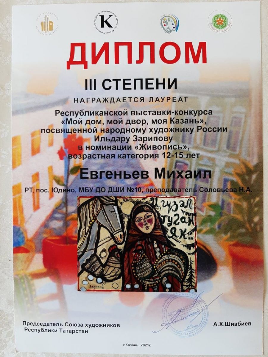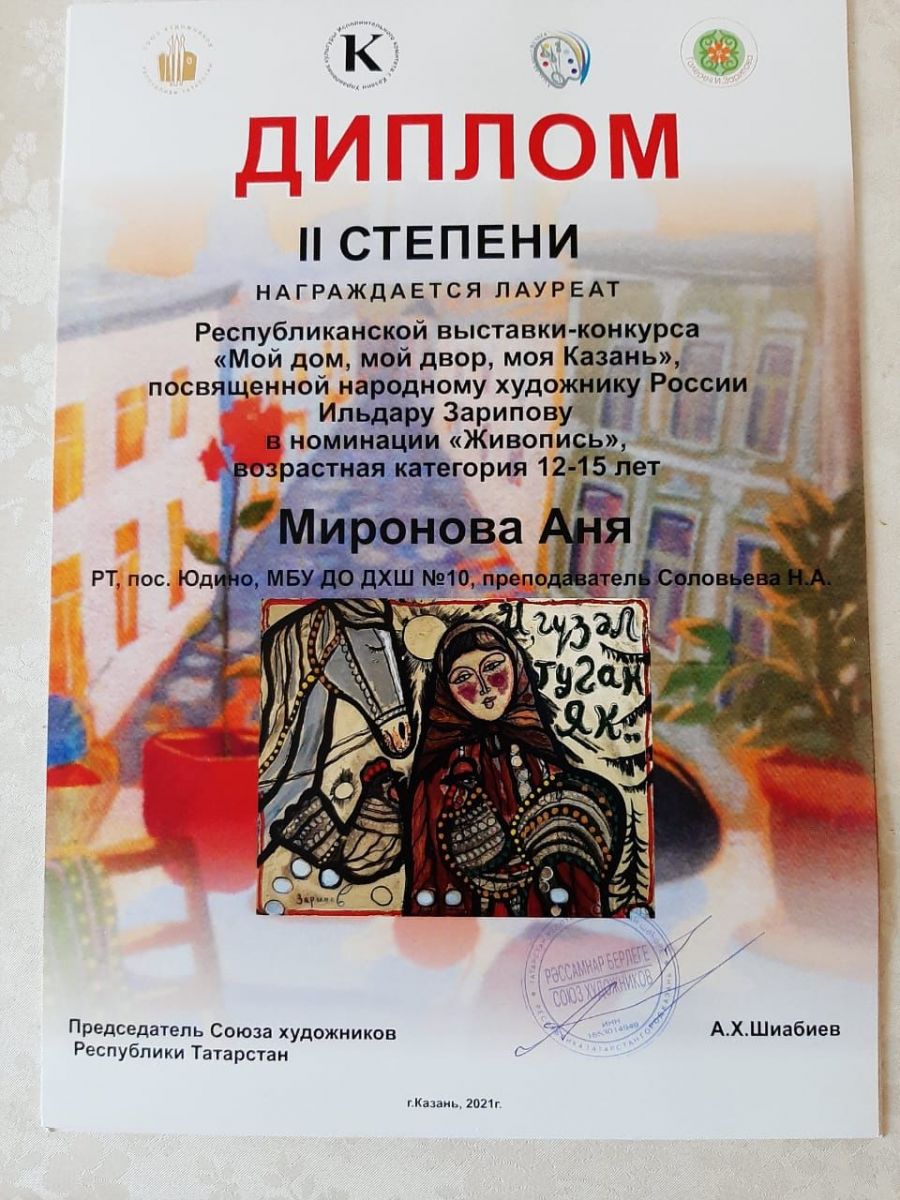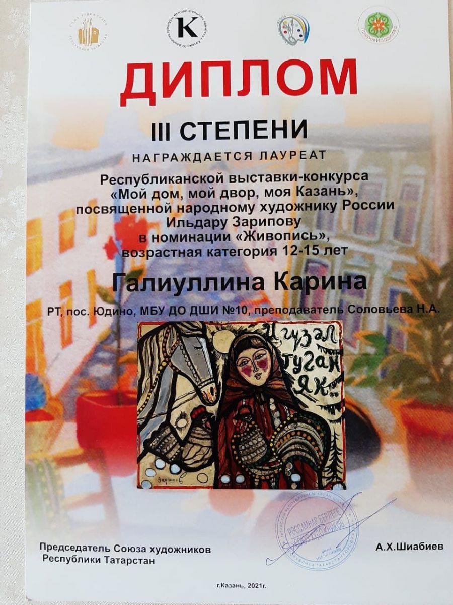 В г.Казань проходила Республиканская выставка-конкурс "Мой дом, мой двор, моя Казань", посвященная народному художнику России Ильдару Зарипову. В данной выставке-конкурсе представили свои работы учащиеся художественного отделения МБУДО "Детская школа искусств №10" г.Казани класса преподавателя Соловьевой Натальи Анатольевны. По результатам выставки-конкурса Миронова Анна была награждена дипломом II степени, а Евгеньев Михаил и Галиуллина Карина дипломами III степени. Поздравляем учащихся и преподавателя с отличными результатами выставки-конкурса и желаем дальнейших успехов.