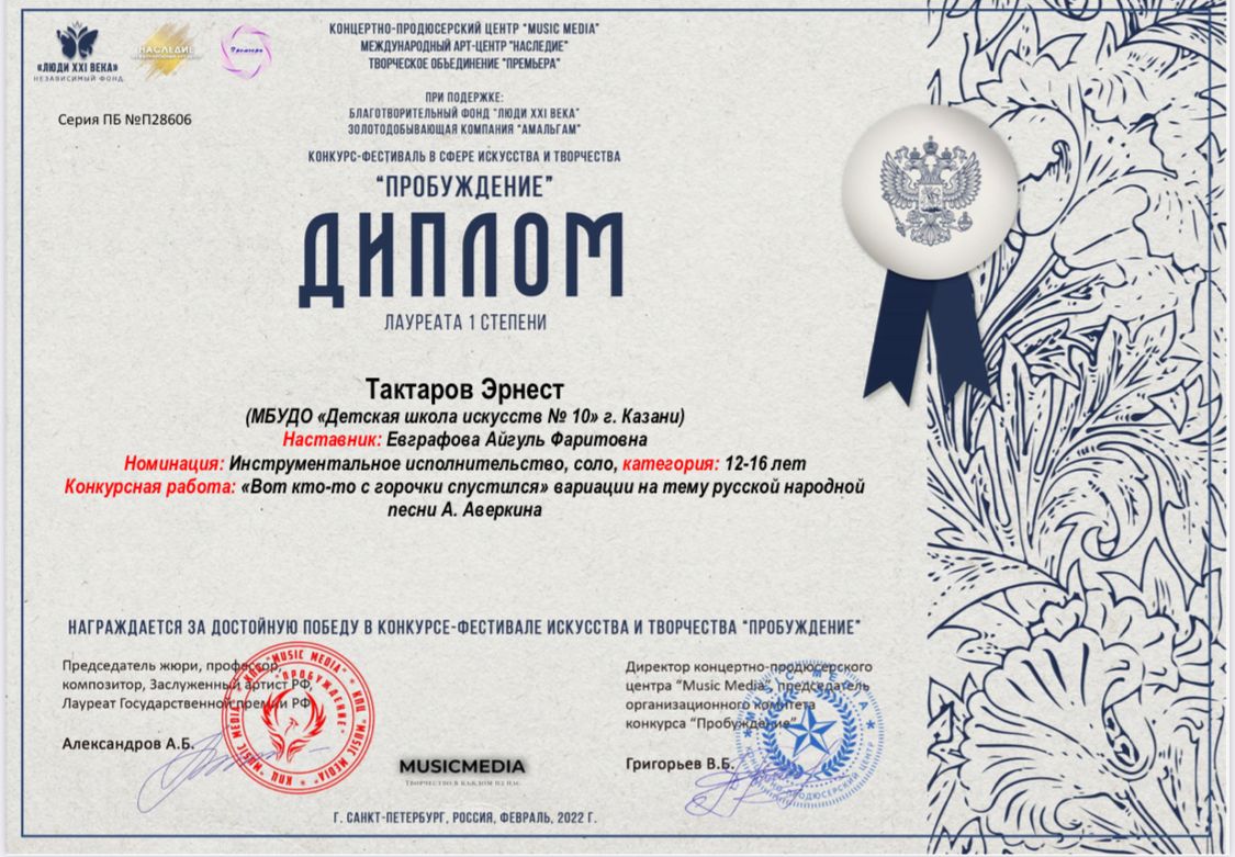 В феврале 2022 года в гСанкт-Петербург проходил конкурс-фестиваль в сфере искусства и творчества "Пробуждение", на котором нашу школу представлял учащийся народного отделения Тактаров Эрнест (класс преподавателя Евграфовой А.Ф.) с вариациями на тему русской народной песни в обработке А.Аверкина "Вот кто-то с горочки спустился". По итогам конкурса Эрнест удостоился звания лауреата I степени. Поздравляем Эрнеста и Айгуль Фаритовну с достойной победой в конкурсе-фестивале и желаем дальнейших успехов в творчестве. Администрация школы выражает благодарность Евграфовой А.Ф. за труд.