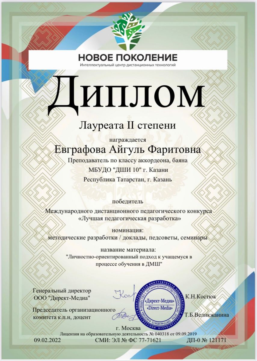 Преподаватель по классу аккордеона, баяна МБУДО "ДШИ №10" Евграфова Айгуль Фаритовна стала победителем в Международном дистанционном педагогическом конкурсе "Лучшая педагогическая разработка" (г.Москва) в номинации: методические разработки / доклады, педсоветы, семинары, завоевав диплом лауреата 2 степени. Поздравляем Айгуль Фаритовну и желаем дальнейших профессиональных достижений. Администрация школы выражает благодарность Евграфовой Айгуль Фаритовне за труд.