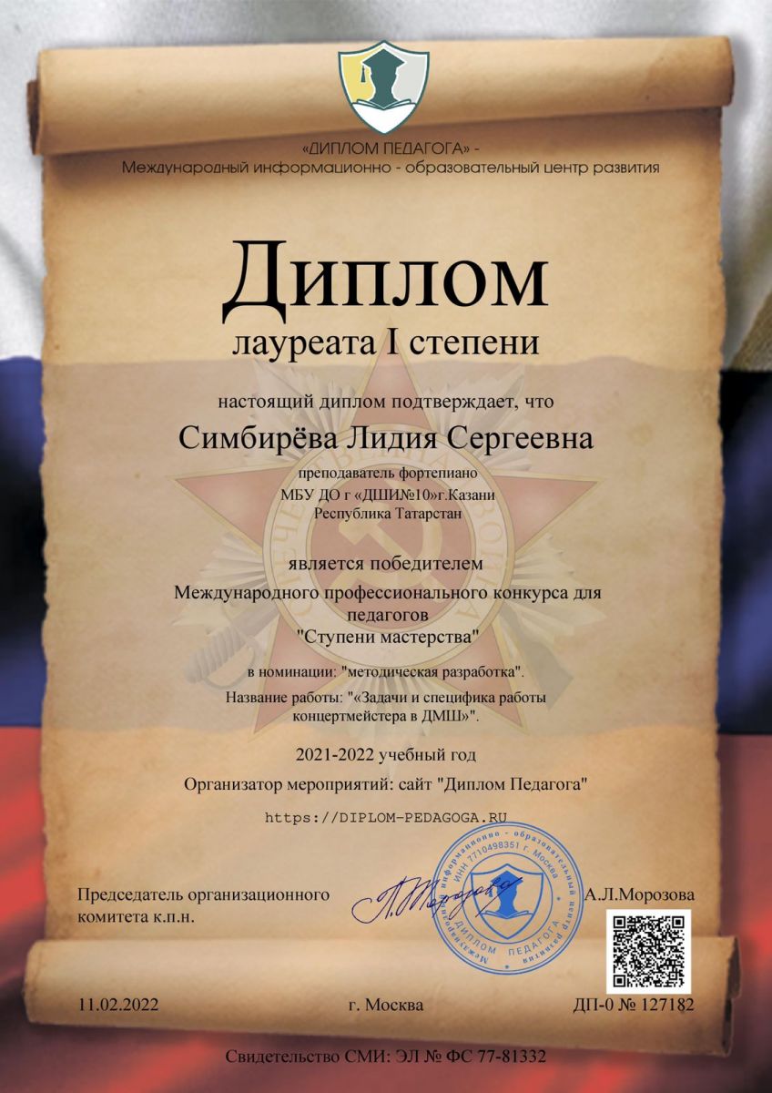 11 февраля в г.Москва прошёл Международный профессиональный конкурс для педагогов «Ступени мастерства», в котором приняла участие преподаватель фортепианного отделения МБУДО "ДШИ №10" г.Казани, Симбирёва Лидия Сергеевна и стала лауреатом 1 степени в номинации «Методическая разработка» с конкурсной работой «Задачи и специфика работы концертмейстера в ДМШ». Поздравляем Лидию Сергеевну с личной победой и желаем новых творческих успехов! Администрация школы выражает благодарность Лидии Сергеевне за проделанную работу.