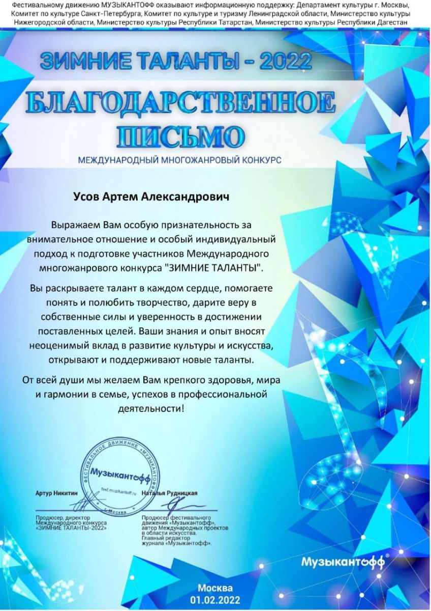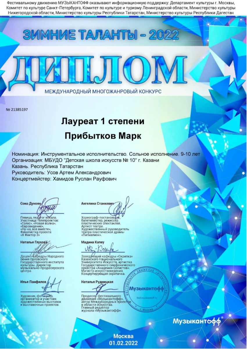В г. Москва прошёл Международный многожанровый конкурс «Зимние таланты-2022», в котором принял участие ученик народного отделения МБУДО "ДШИ №10" г. Казани (класс преподавателя Усова А.А., концертмейстер Хамидов Р.Р.), Прибытков Марк и стал лауреатом I степени! Поздравляем преподавателей Усова Артема Александровича и Хамидова Руслана Рауфовича и Прибыткова Марка с успешным выступлением на конкурсе, а также желаем новых творческих побед! Администрация школы выражает благодарность преподавателю Усову Артему Александровичу и концертмейстеру Хамидову Руслану Рауфовичу за подготовку учащегося к конкурсу.