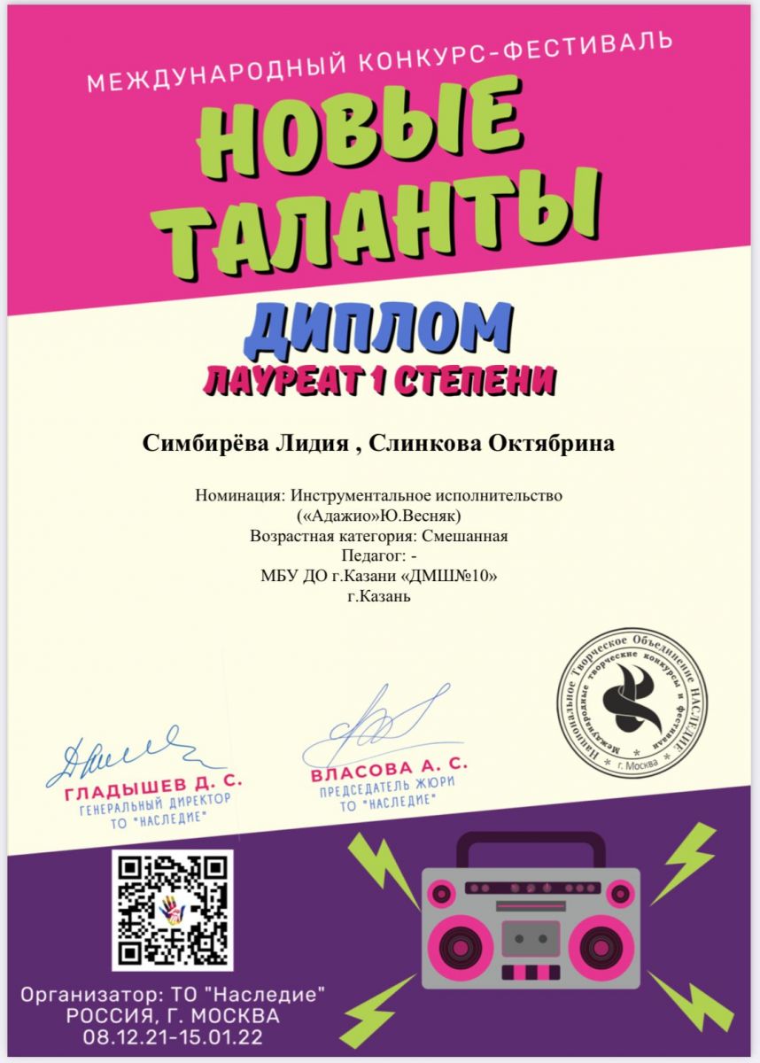 Сегодня мы поздравляем преподавателей фортепианного отделения МБУДО "ДШИ №10" г. Казани Симбирёву Л.С. и Слинкову О.В., которые приняли участие в Международном конкурсе-фестивале «Новые таланты» (г.Москва) и стали обладателями диплома лауреата 1 степени!