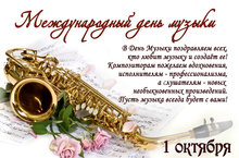 Начиная с 1975 года ежегодно 1 октября отмечается Международный день музыки. Музыка (от греческого musike, буквально — «искусство муз») — вид искусства, в котором средством воплощения художественных образов служат определенным образом организованные музыкальные звуки. С музыкой человечество знакомо с давних времен. Музыка обладает огромной силой. На свете найдется мало людей, равнодушных к музыке. Многие композиторы пытались выразить через нее состояние своей души. Их великие имена всегда с благодарностью будут произносить потомки. Музыка не стареет, она будет жить столько, сколько будет существовать человек. Ведь музыка воздействует на восприятие человека, наполняет его эмоциями. Это не только творческое самовыражение композиторов, музыкантов и певцов, на протяжении веков и тысячелетий музыка была неотделимой частью культурной традиции, религиозного обряда и повседневного существования каждого народа. И в настоящее время, к счастью, музыка не утратила своего значения, а напротив — потребность в ней увеличивается. Администрация школы поздравляет преподавателей школы, родителей, учащихся с этим замечательным праздником и желает, чтобы музыка всегда наполняла вашу жизнь яркими красками и дарила душевное тепло.
