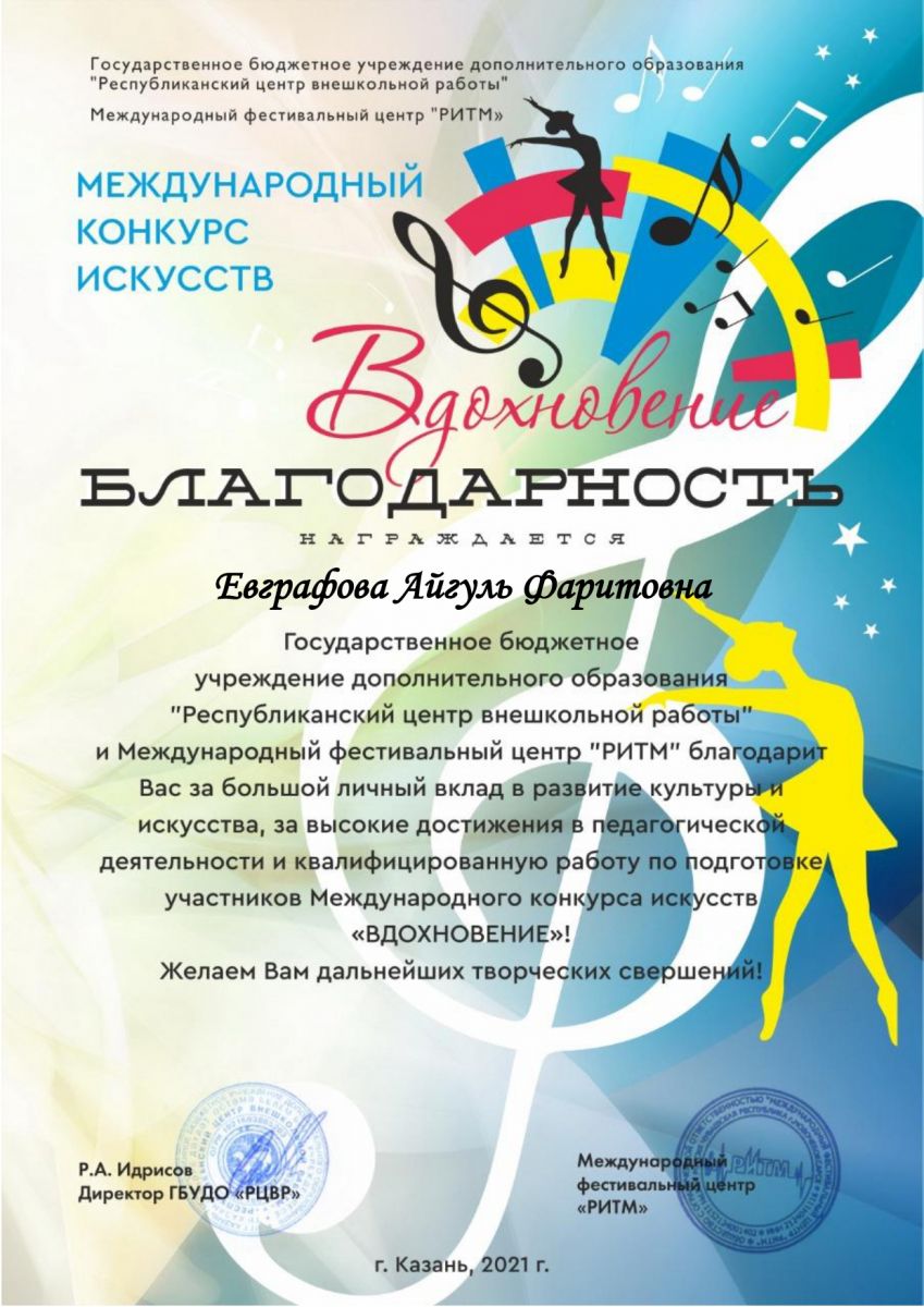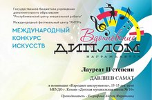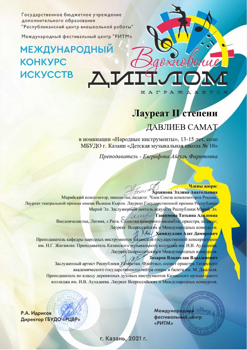 В г. Казани прошел Международный конкурс искусств "Вдохновение", на котором нашу школу с честью представил ученик отделения народных инструментов Давлиев Самат (класс преподавателя Евграфовой А.Ф.). Самат стал обладателем диплома лауреата II степени в номинации "Народные инструменты" соло. Поздравляем Самата и его преподавателя Евграфову Айгуль Фаритовну с отличным результатом и желаем и дальше покорять творческие вершины. Администрация школы выражает благодарность Евграфовой А.Ф. за подготовку учащегося к конкурсу.