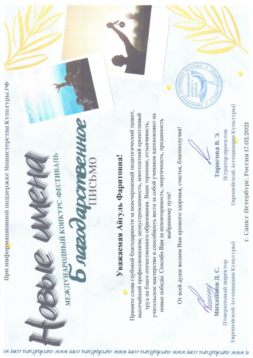 В Польше, г. Варшаве, состоялся Международный многожанровый конкурс-фестиваль "Тake it and do it" при информационной поддержке Министерства культуры Российской Федерации. На конкурсе нашу школу представляли ученицы: Гузаярова Ясмин, Иматдинова Амина, Камардина Алиса и Уразова Лейсан (класс преподавателя Жолобовой Лилии Ивановны). По итогам конкурса Гузаярова Ясмина, Иматдинова Амина и Уразова Лейсан стали обладателями диплома лауреата II степени, а Камардина Алиса удостоилась диплома III степени. Поздравляем учеников нашей школы и их преподавателя Жолобову Л.И. и желаем дальнейших творческих успехов! Администрация школы выражает благодарность преподавателю Жолобовой Л.И. за опдготовку учащихся к конкурсу.