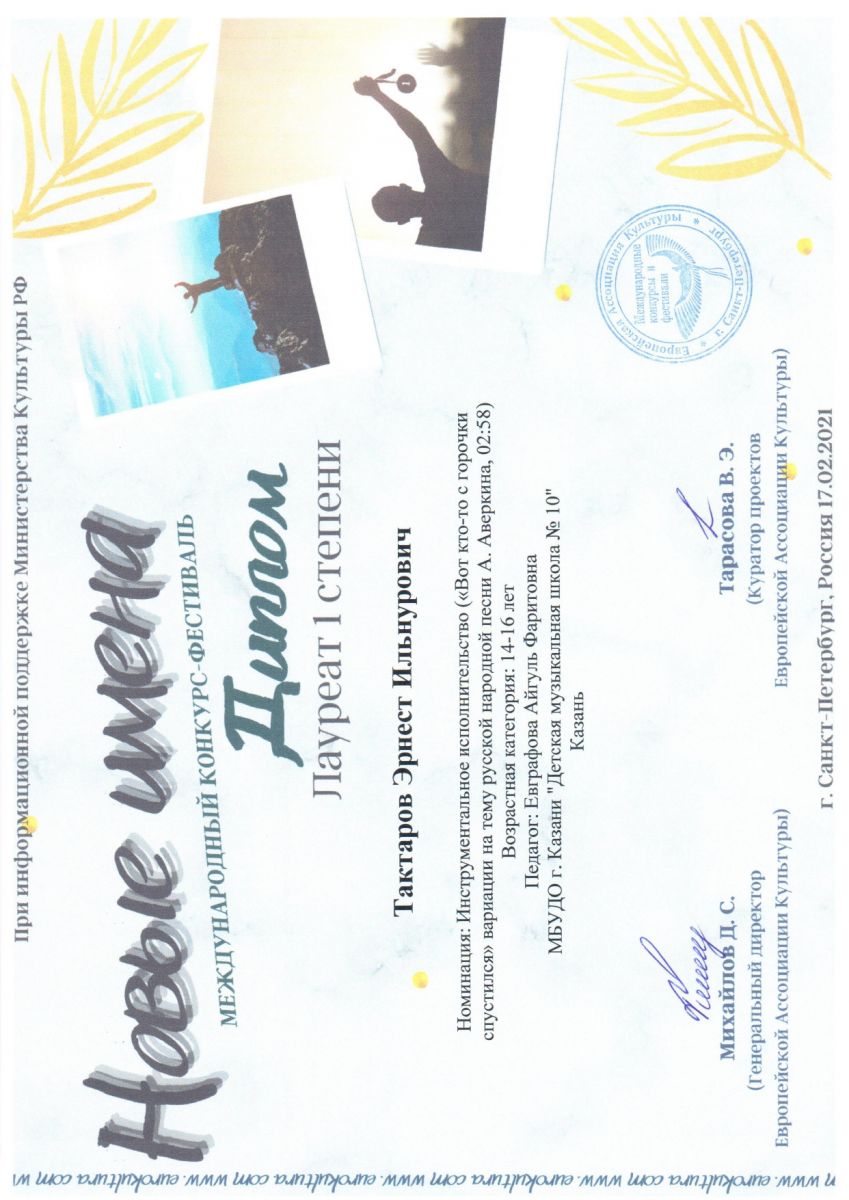 17.02.2021 в г. Санкт-Петербург проходил международный конкурс-фестиваль "Новые имена" при информационной поддержке Министерства Культуры РФ. В конкурсе-фестивале принял участие ученик нашей школы Тактаров Эрнест (класс преподавателя Евграфовой А.Ф.) в номинации инструментальное исполнительство, исполнив вариации на тему русской народной песни А. Аверкина "Вот кто-то с горочки спустился". По результатам конкурса, Тактаров Эрнест стал обладателем диплома лауреата I степени. Поздравляем Эрнеста и его преподавателя Евграфову Айгуль Фаритовну с отличным выступлением на конкурсе-фестивале и желаем дальнейших побед! Администрация школы благодарит преподавателя Евграфову Айгуль Фаритовну за труд.