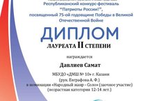 Поздравляем ученика нашей школы Давлиева Самата (класс преподавателя Евграфовой А.Ф.) с дипломом лауреата II степени на Республиканском конкурсе - фестивале "Патриоты России!" , который был посвящен 75-ой годовщине Победы в Великой Отечественной Войне. Администрация школы выражает благодарность преподавателю Евграфовой А.Ф. за подготовку конкурсанта.