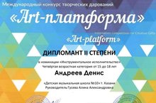 29 ноября 2020 года в г. Казань проходил Международный конкурс творческих дарований "Art платформа", на котором ученик нашей школы Андреев Денис (класс преподавателя Гусевой А.А.), в номинации "Инструментальное исполнительство", стал дипломантом II степени. Администрация школы выражает благодарность Гусевой А.А. за подготовку учащегося к конкурсу.