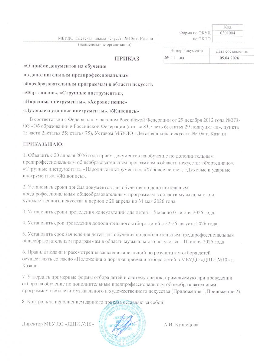 Приказ о зачислении учащихся в 1 класс на музыкальное отделение