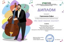 Поздравляем с победой во Всероссийском творческом конкурсе "Кто такой работник культуры?" нашу ученицу Герасимову Софью! Желаем дальнейших побед и успехов!