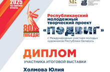 Поздравляем ученицу "ДХШ №3 им.Б.М.Альменова" Холмову Юлию с участием в итоговой выставке Республиканского молодежного творческого проекта "ПОДВИГ" с Международным участием молодых художников республики Беларусь.