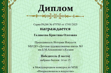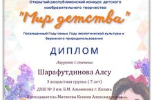 Учащиеся "ДХШ №3 им.Б.М.Альменова" г.Казани были награждены дипломом об участии в межрегиональной академической выставке "Идель-Арт 2024" проходящей в залах "Хазинэ" г.Казани с 16 апреля 24г по 30 мая 24г.