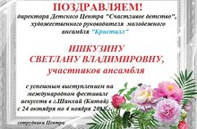 Поздравляем директора Детского Центра "Счастливое детство"Ишкузину Светлану Владимировну и участников молодежного хореографического ансамбля "Кристалл" с успешным выступление на международном фестивале искусств, который прошел с 24.10.18 г по 03.11.18 г в городе Шанхай (Китай)