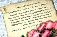 Примите наши самые теплые поздравления с Юбилеем! От всей души желаем Вам крепкого здоровья, мира, оптимизма и жизнелюбия, неиссякаемой энергии, успехов во всех начинаниях и воплощения самых смелых планов. Пусть ваша жизнь всегда остается наполненной пониманием и поддержкой Вашего коллектива, теплом домашнего очага, любовью родных и близких.