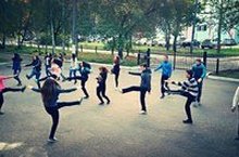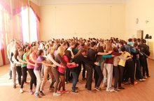 На утро после студенческой конференции, студенты нового набора принялись за работу и организовали зарядку около входа в техникум.