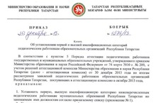 В соответствии с приказом Министерства образования и науки Республики Татарстан от 30 декабря 2013 г. № 4974/13 «Об установлении первой и высшей квалификационных категорий педагогическим работникам образовательных организаций Республики Татарстан»