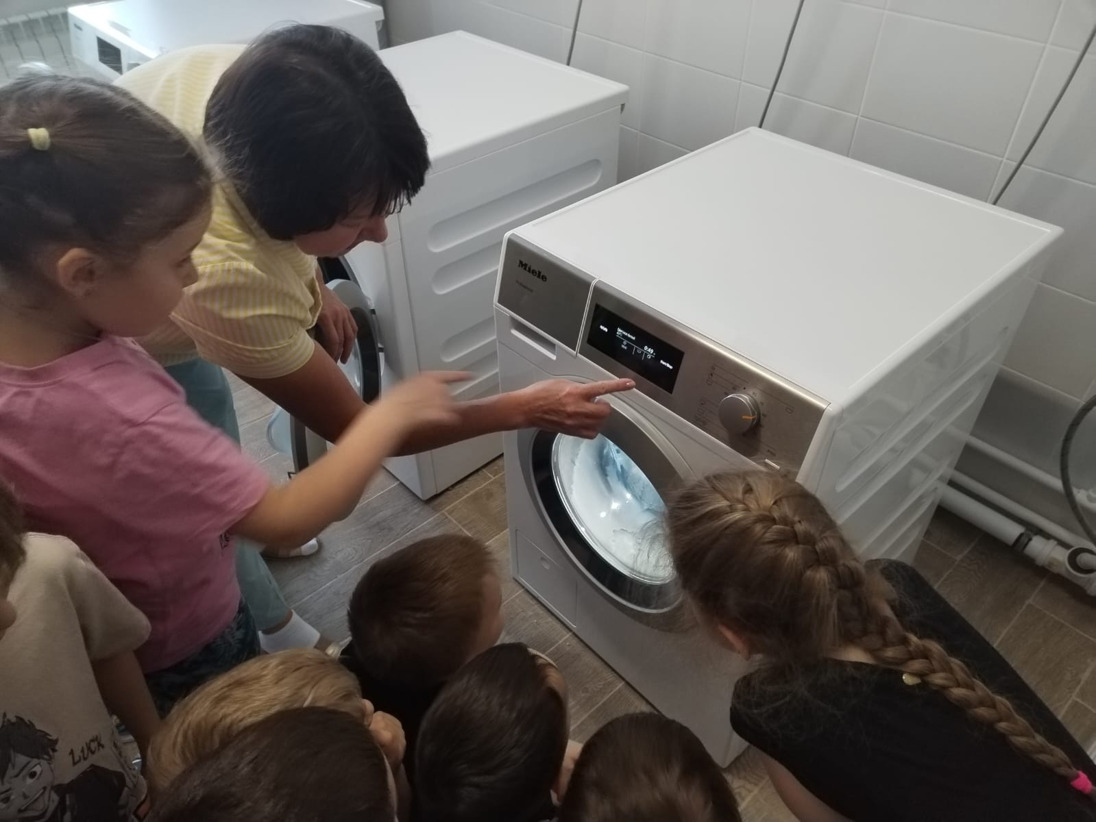 Ребята познакомились с профессией прачки и кастелянши, узнали, как много труда вложено, чтобы полотенца и постельное белье всегда были чистыми и аккуратно выглаженными.