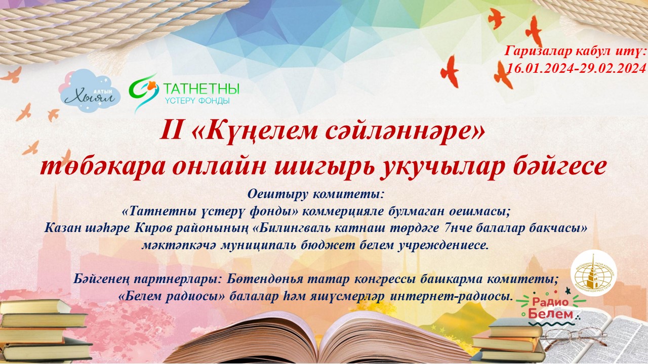 Жюри тарафыннан ll "Күңелем сәйләннәре" төбәкара онлайн шигырь укучылар бәйгесенә килгән эшләр тыңланды. Тиздән нәтиҗәләр Детский сад №7 "Алтын хыял" Казань һәм Татнетны үстерү фонды. Фонд развития Татнета сайтларына эленәчәк.