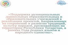 В нашей Республике был объявлен конкурс на получение гранта "Поддержка муниципальных и дошкольных образовательных учреждений в реализации проектов, направленных на сохранение и развитие традиций, культур народов, проживающих на территории Республики Татарстан, в рамках Года родных языков и народного единства". Обладателями гранта стали 200 образовательных учреждений республики. Среди них- и наш детский сад.