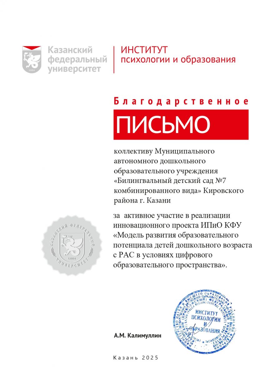 Коллектив детского сада принял активное участие в реализации инновационного поекта ИПиО КФУ и был награжден благодарственным письмом.