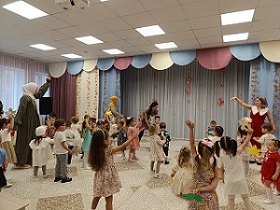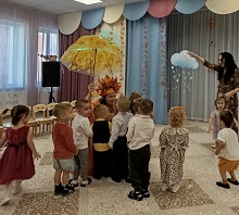 В детском саду продолжается череда осенних утренников. К ребятам заглянула на праздник красавица - Осень, принесла гостинцы: сладкие яблоки. Дети с нетерпением ждали встречу с Осенью. Ребята вместе с ней играли, танцевали танец с листочками, пели песни и рассказывали стихи. Все ребята остались довольными, счастливыми и получили массу положительных эмоций.
