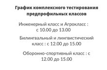 Уважаемые родители будущих учеников предпрофильных классов. 6 июня приглашаем ваших детей для прохождения комплексного тестирования в предпрофильные классы согласно графику. Участники теоретического этапа могут взять с собой в аудиторию чёрную гелевую ручку, очки, шоколад и воду. В аудиторию не разрешается брать бумагу, любые справочные материалы (словари, справочники, учебники и т.д.), мобильные телефоны, диктофоны, плееры и любые другие технические средства. Учащиеся которые сдают нормативы по ОФП для поступления в оборонно-спортивный класс необходимо наличие спортивной формы, головного убора и воды. Не разрешается наличие сотовых телефонов и формы не соответствующей для сдачи нормативов. Процедура проведения конкурсного испытания письменного тестирования и сдачи нормативов составляет 180 астрономических минут.