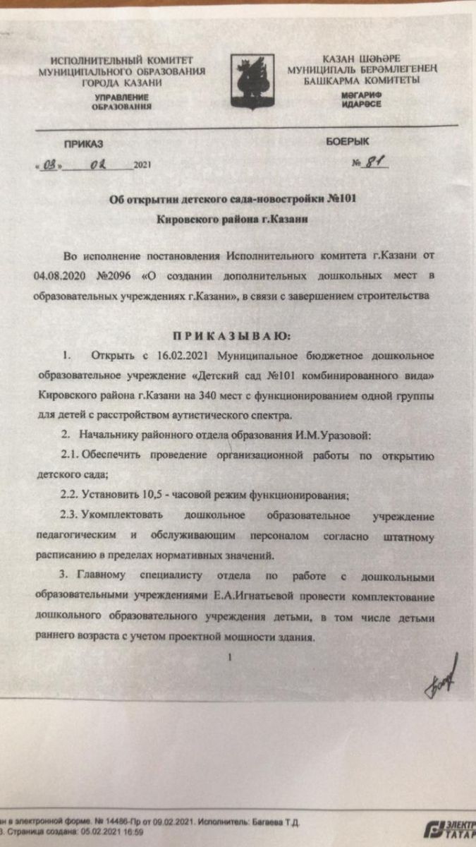 Муниципальное бюджетное дошкольное образовательное учреждение "Детский сад № 101 комбинированного вида" Кировского р-на г.Казани был открыт 1 марта 2021 года