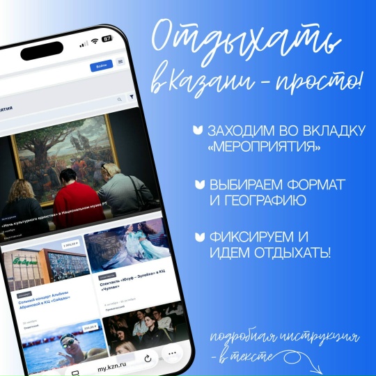 Настраиваемся на активный отдых: вслед за шестидневной рабочей неделей наступят ноябрьские праздники. А спланировать досуг поможет портал «Моя Казань» my.kzn.ru/