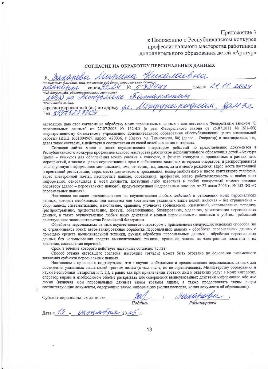 Согласие на обработку персональных данных руководителя МБУДО "ЦДОД "Сэяхэт" - Захаровой М.Н.