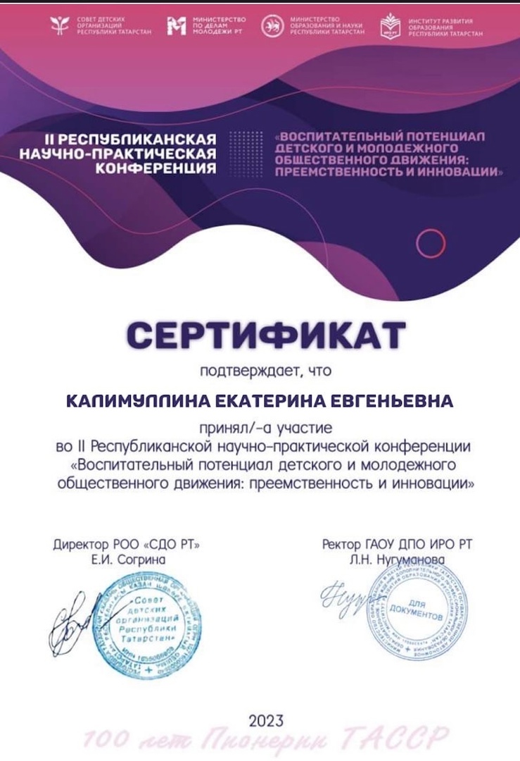 Опубликовано: 19.05.202319 мая прошла II Республиканская научно-практическая конференция «Воспитательный потенциал детского и молодежного общественного движения: преемственность и инновации», посвященной 100-летию Пионерской организации ТАССР.