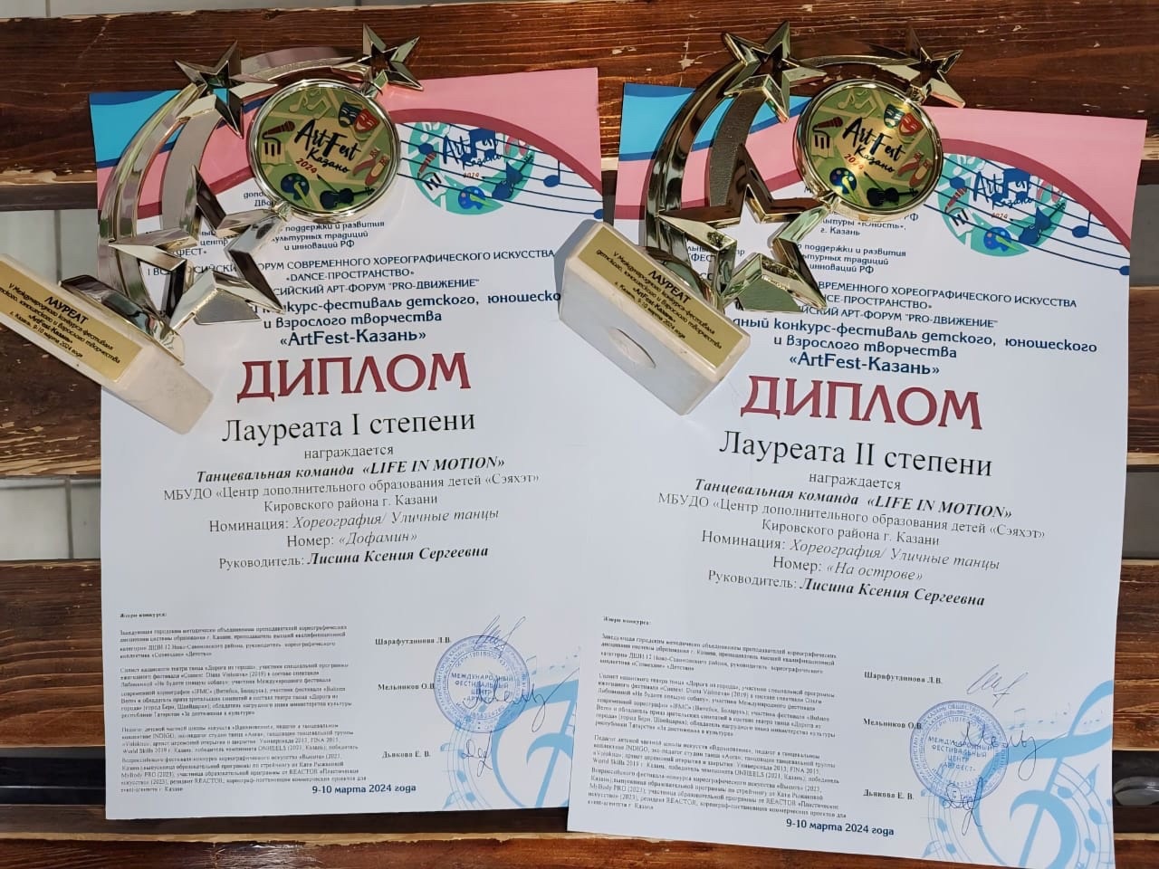 Опубликовано: 11.03.2024► В прошедшие выходные танцевальная команда LIFE IN MOTION под руководством Лисиной Ксении Сергеевны приняли участие в V международном фестивале-конкурсе ArtFest-Казань и заняли I и II места.