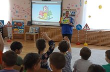 Ведущий специалист отдела профилактики ТУ в г.Казани ГБУ 'БДД" Галина Аркадьевна Шлакова провела беседу с детьми о ПДД, о необходимости ношения СВЭ в темное время суток и показала мультфильм "Дозорные дорог". -