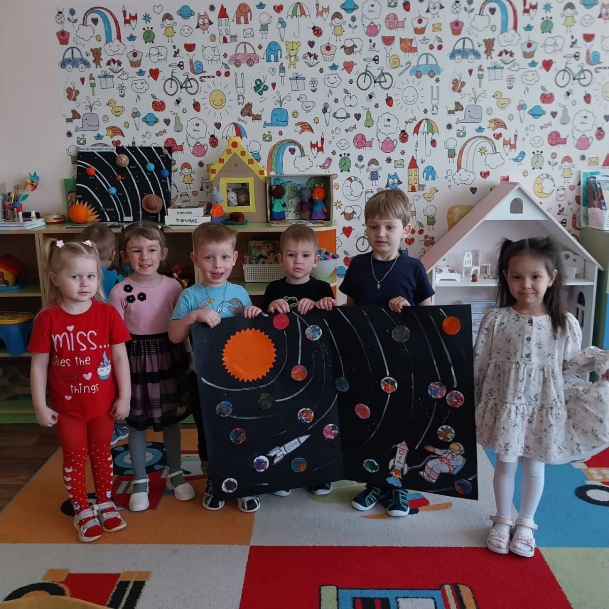 Проведенные в группах занятия и беседы были направлены на развитие познавательных и творческих способностей воспитанников, которые осуществлялись через различные виды детской деятельности – чтение рассказов о космосе, планетах, космонавтах, посещение космического планетария , выставка детских рисунков и детских поделок на тему «Космические просторы »
